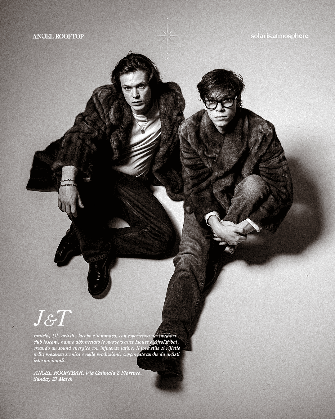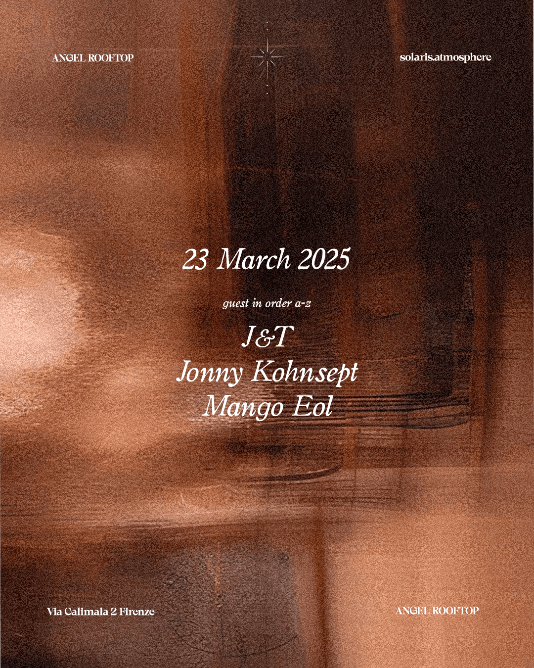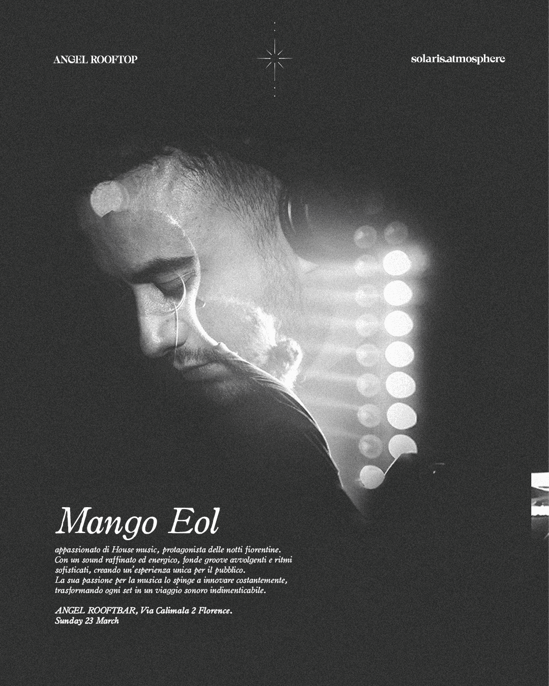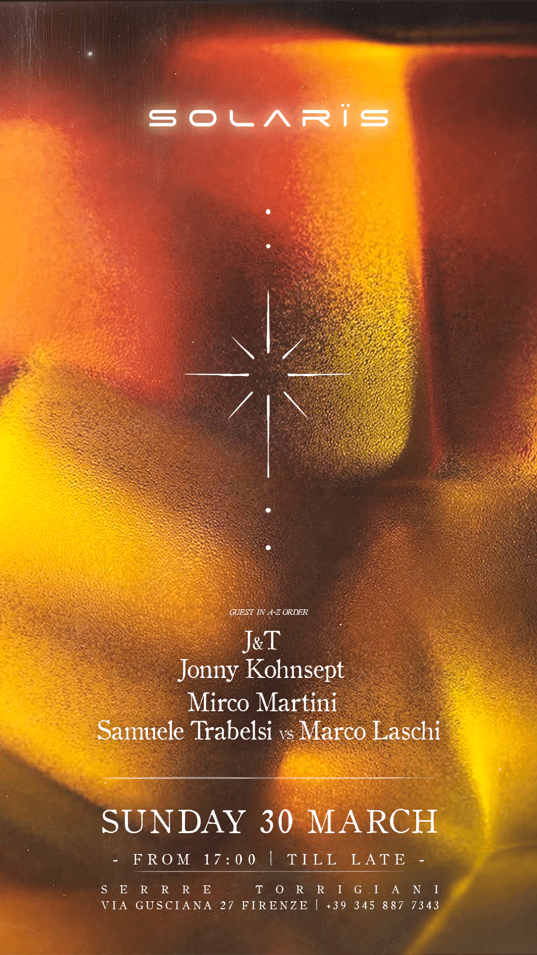La sfida è stata affrontata creando un linguaggio grafico che unisce il concetto di sole e tramonto con uno stile raffinato, in linea con il target esclusivo di Solaris. Le texture calde e luminose richiamano la golden hour, mentre i layout minimali e tipografici trasmettono eleganza e contemporaneità. Ai flyer si affianca una serie di ritratti fotografici in bianco e nero, capaci di dare un volto autentico e sofisticato agli artisti. Questa combinazione rende il format riconoscibile e coerente, rafforzandone il posizionamento nel panorama fiorentino.